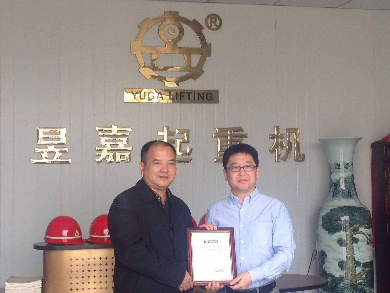 凱道起重設(shè)備(上海)有限公司技術(shù)部村松部長(右)為廣東昱嘉起重機(jī)KITO指定售后服務(wù)商授牌